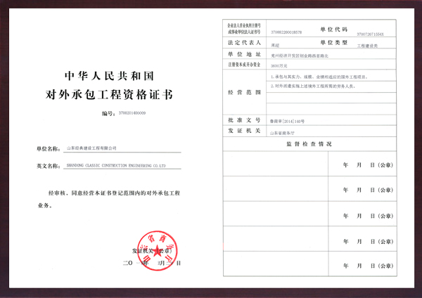 近日,山東經典建設工程有限公司對外承包工程業務經山東省商務廳批準,獲得了《中華人民共和國對外承包工程資格證書》。至此,山東經典建設工程有限公司具備了承包對外工程項目資格。