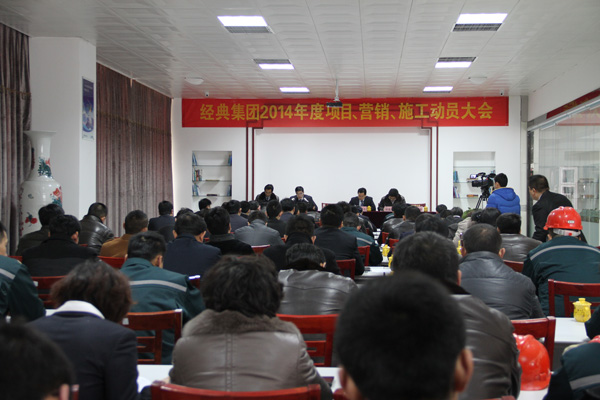 2月7日,為推進2014年度戰略目標順利實施,經典集團隆重召開項目、營銷施工動員大會。集團公司高層領導苗樹文、杜福生、鄭建康、司紅玲、鄭利昌、高建國出席了此次會議,集團公司有關部門負責人、項目經理、營銷人員、施工隊長、生產車間負責人等80人參加了此次大會。