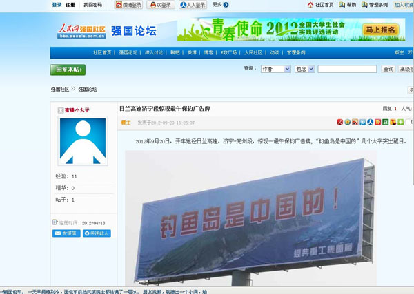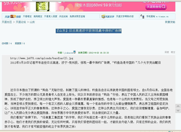 近一段時期以來日本推出了所謂的“購島”無恥行徑,刺激了國人的神經,我們集團作為中華民族大家庭的一員,有責任也有義務保衛(wèi)我們祖國領土的完整,和不容侵犯,為此集團領導代表集團全體員工通過各種方式彰示了我們的愛國熱情,并付諸于實際行動斥巨資在日蘭高速濟寧段制作了高炮廣告“釣魚島是中國的”以顯示我們保釣之決心。